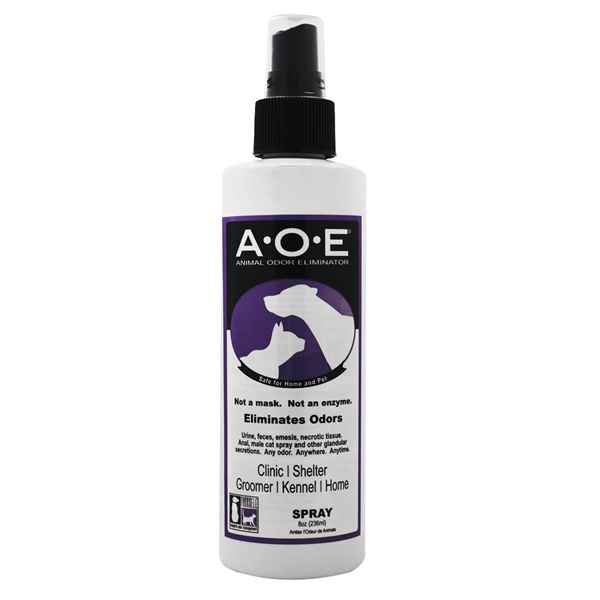 Eliminates, not masks, odors from anal gland secretion, tom cat spray, necrotic tissue, urine, feces, emesis, etc. Also available in a tub of 80 disposable wipes Eliminates odors on the animal including anal gland secretion, tom cat spray, necrotic tissue, urine, feces, emesis, etc. Also can be used in the kennel and grooming areas and the dog & cat wards. Use A.O.E. to eliminate odors on walls and floors and in cages and other large areas of the clinic. Keeping these areas clean and odor-free will ensure that all of your patients are sent home in optimal condition and that the unpleasant odors in the clinic are not going home with them. A.O.E. products eliminate odors, they do not mask them. They are not enzymes so they can be used in areas where other cleaning solutions have been used without a decrease in efficacy