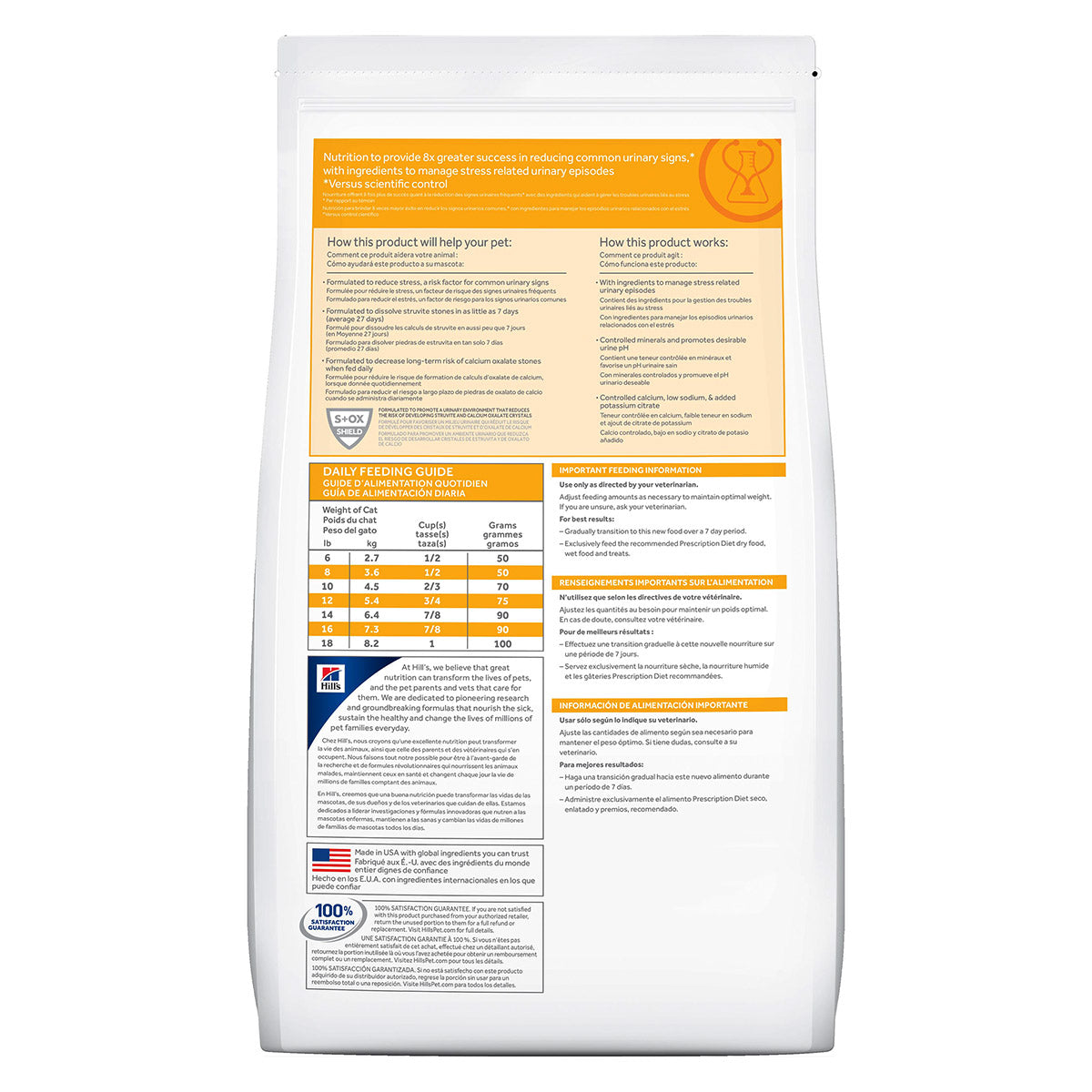 A healthy bladder starts with the right balance of vital nutrients. Excess minerals can encourage the formation of crystals in the urine, which may lead to the creation of bladder stones. They can cause discomfort and lead to more serious problems that require the care of a veterinarian. Stress in the home has been shown to negatively impact bladder health as well. Hill's nutritionists & veterinarians developed Prescription Diet c/d Multicare Stress Dry Cat Food clinical nutrition specially formulated to support a cat's urinary health while also managing stress. In fact, c/d Multicare is clinically tested nutrition to lower the recurrence of most common urinary signs by 89%. •Formulated to reduce stress, a risk factor for common urinary signs •Formulated to dissolve struvite stones in as little as 7 days (average 27 days) •Formulated to decrease long-term risk of calcium oxalate stones when fed daily •S+OXSHIELD: Formulated to promote a urinary environment that reduces the risk of developing struvite & calcium oxalate crystals •Recommended for lifelong feeding of adult cats INGREDIENTS: Ocean Fish, Cracked Pearled Barley, Whole Grain Oats, Brewers Rice, Corn Gluten Meal, Wheat Gluten, Chicken Fat, Chicken Meal, Chicken Liver Flavor, Soybean Oil, Lactic Acid, Flaxseed, Calcium Sulfate, Fish Oil, Potassium Chloride, Choline Chloride, L-Lysine, Taurine, Iodized Salt, DL-Methionine, Potassium Citrate, vitamins (Vitamin E Supplement, Niacin Supplement, Thiamine Mononitrate, Pyridoxine Hydrochloride, Calcium Pantothenate, Riboflavin Supplement, Biotin, Vitamin A Supplement, Vitamin B12 Supplement, Folic Acid, Vitamin D3 Supplement), Cysteine, Dried Hydrolyzed Casein, L-Tryptophan, L-Arginine, minerals (Ferrous Sulfate, Zinc Oxide, Copper Sulfate, Manganous Oxide, Calcium Iodate, Sodium Selenite), Mixed Tocopherols for freshness, Natural Flavors, Beta-Carotene. Nutrient Dry Matter% Protein 34 % Fat 17.1 % Carbohydrate / NFE 42.1 % Crude Fiber 0.9 % Calcium 0.81 % Phosphorus 0.67 % Potassium 0.78 % Sodium 0.39 % Magnesium 0.08 % Taurine 0.39 % Vitamin C 2 ppm Vitamin E 760 IU/kg Total Omega-3 F A 1.06 % Total Omega-6 FA 4.41 % *The nutrient in the product after moisture is removed. It is used to make direct comparisons of nutrient profiles with differing moisture contents. 3894 kcal/kg (397 kcal/cup) (An eight fluid oz. measuring cup of c/d Multicare Stress with Ocean Fish Dry Cat Food contains 3.6 oz. by weight.)